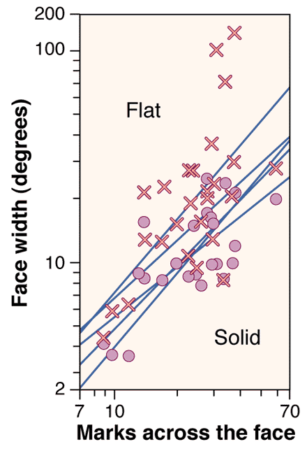 The nose test. The critical face width of Close's portraits plotted against the number of marks across the face. The regression lines, one for each of five observers (accounting for half of the variance), are plots of the results for judging nose emergence on each of the 33 gridded portraits from the Chuck Close retrospective (except the Keith/Six Drawings Series) (2). X and O are raw data for two observers. Size independence predicts a vertical line. All five lines have log-log slopes close to 1 (mean 1.0, SD ± 0.2), showing that the perceived shape does depend on size.